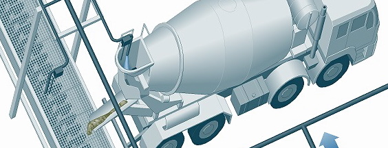 Der aus Fahrmischern oder Betonpumpen ausgespülte Restbeton wird in einer Recyclinganlage per Förderschnecke in wiederverwertbaren Mischkies und Betonwasser getrennt.